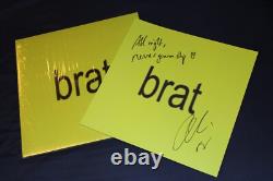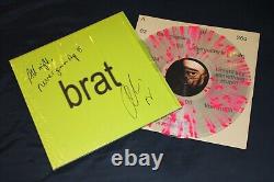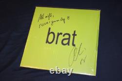 Charli XCX - Brat vinyl with front cover artcard hand signed & personalized. " 12" Pink Splatter Vinyl with 12x12 front cover artcard. Charli XCX & personalized with the lyrics "All night, never gonna stop". This was an exclusive from Banquet Records. Check out my other Signed Vinyl!